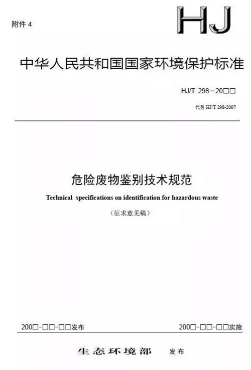 為貫徹《中華人民共和國環境保護法》《中華人民共和國固體廢物污染環境防治法》,防治危險廢物造成的環境污染,加強對危險廢物的管理,保護環境,保障公眾健康,我部修訂形成了**環境保護標準《危險廢物鑒別標準 通則(征求意見稿)》(GB5085.7)、《危險廢物鑒別技術規范(征求意見稿)》(HJ/T298)。按照《**環境保護標準制修訂工作管理辦法》(國環規科技〔2017〕1號)要求,現將征求意見稿及編制說明印送給你們,請研究并提出書面意見,并于2018年7月15日前反饋我部(電子件請發送至聯系人郵箱),逾期未反饋意見的將按無意見處理。標準征求意見稿及編制說明可登錄我部網站(http://www.zhb.gov.cn/)“意見征集”欄目檢索查閱。